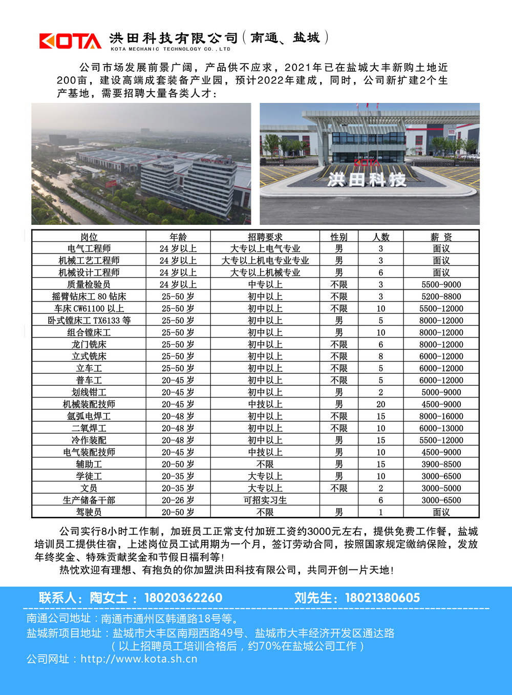 Noua adresă a proiectului Yancheng: nr. 49, Nanxiang West Road, districtul Dafeng, Yancheng City, Tongda Road, Dafeng Economic Development Zone, Yancheng City (după ce angajații recrutați de mai sus sunt calificați în formare, aproximativ 70% vor lucra în Yancheng Company)