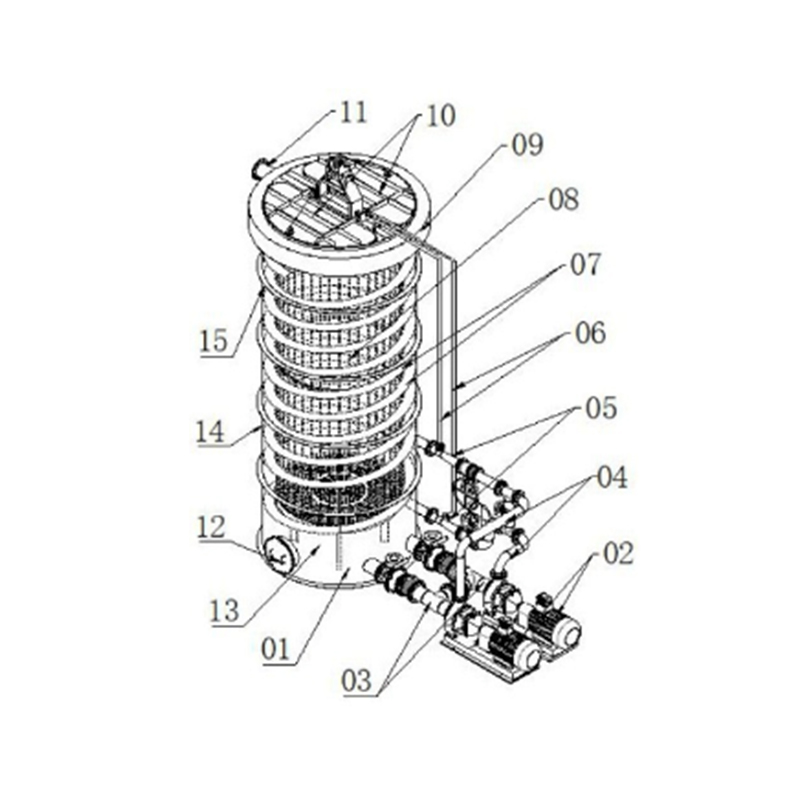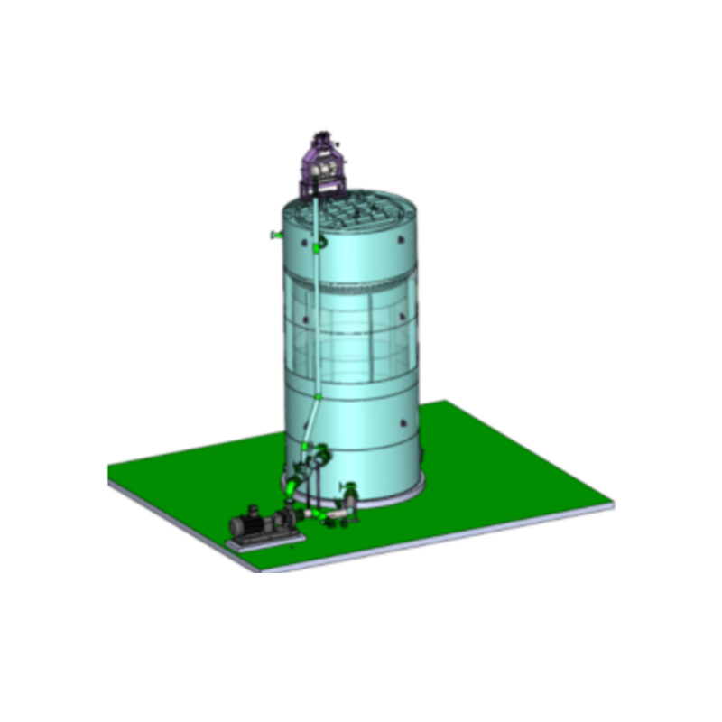 Un rezervor de dizolvare de cupru de înaltă eficiență cuprinde un corp de rezervor de dizolvare a cuprului, în care corpul rezervorului de dizolvare a cuprului cuprinde un blat al rezervorului, un capac de rezervor situat pe partea de sus a rezervorului și un sistem de livrare lichid conectat la o conductă externă a corpului rezervorului de dizolvare a cuprului; Sistemul de livrare a lichidului cuprinde o pompă de circulație rezistentă la acid, o conductă de intrare lichidă, o conductă de ieșire a lichidului, un mixer de injecție de oxigen lichid și o conductă de intrare a aerului; Un dispozitiv de dizolvare a cuprului este aranjat în interiorul corpului rezervorului de dizolvare a cuprului; Dispozitivul de dizolvare a cuprului cuprinde un canal de flux de vortex cu mai multe straturi, un cilindru de grilă, un port de evacuare a aerului, un dispozitiv de gaură, o gaură de descărcare a lichidului de jos, o gaură de ieșire a lichidului din mijloc și o gaură de reumplere a lichidului superior. Intrarea lichidă a pompei de circulație rezistentă la acid este conectată la partea inferioară a corpului rezervorului de dizolvare a cuprului, iar ieșirea lichidă a pompei de circulație rezistentă la acid este conectată la mixerul de injecție de oxigen lichid. The oxygen-rich air and the copper sulfate liquid are fully mixed through the liquid oxygen injection mixer to form a foam flow, and then a vortex flow is generated in the tank body through the multi-layer vortex flow channel on the inner wall of the tank body, forming a huge rotation inside the tank body to flush the copper material in the tank, greatly increasing the contact area and time, thereby greatly improving the copper dissolving speed and eficiență.